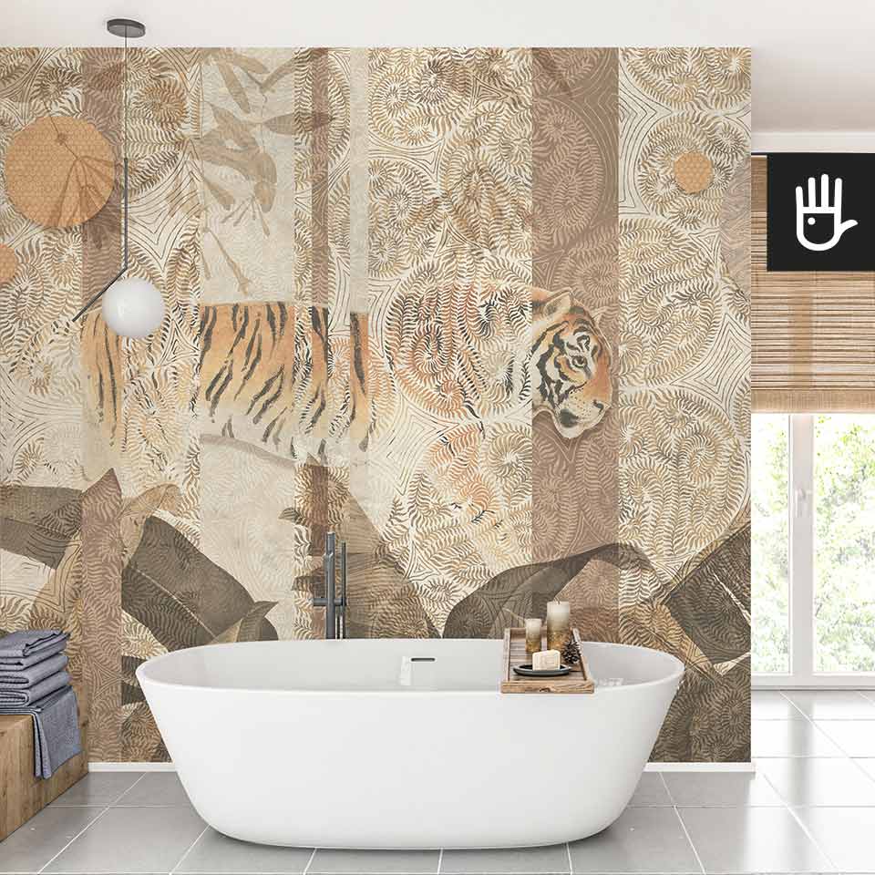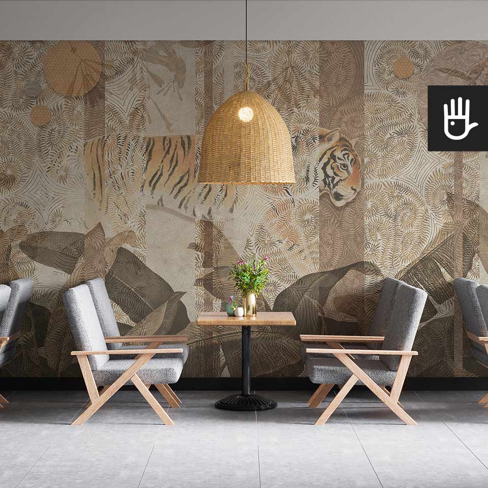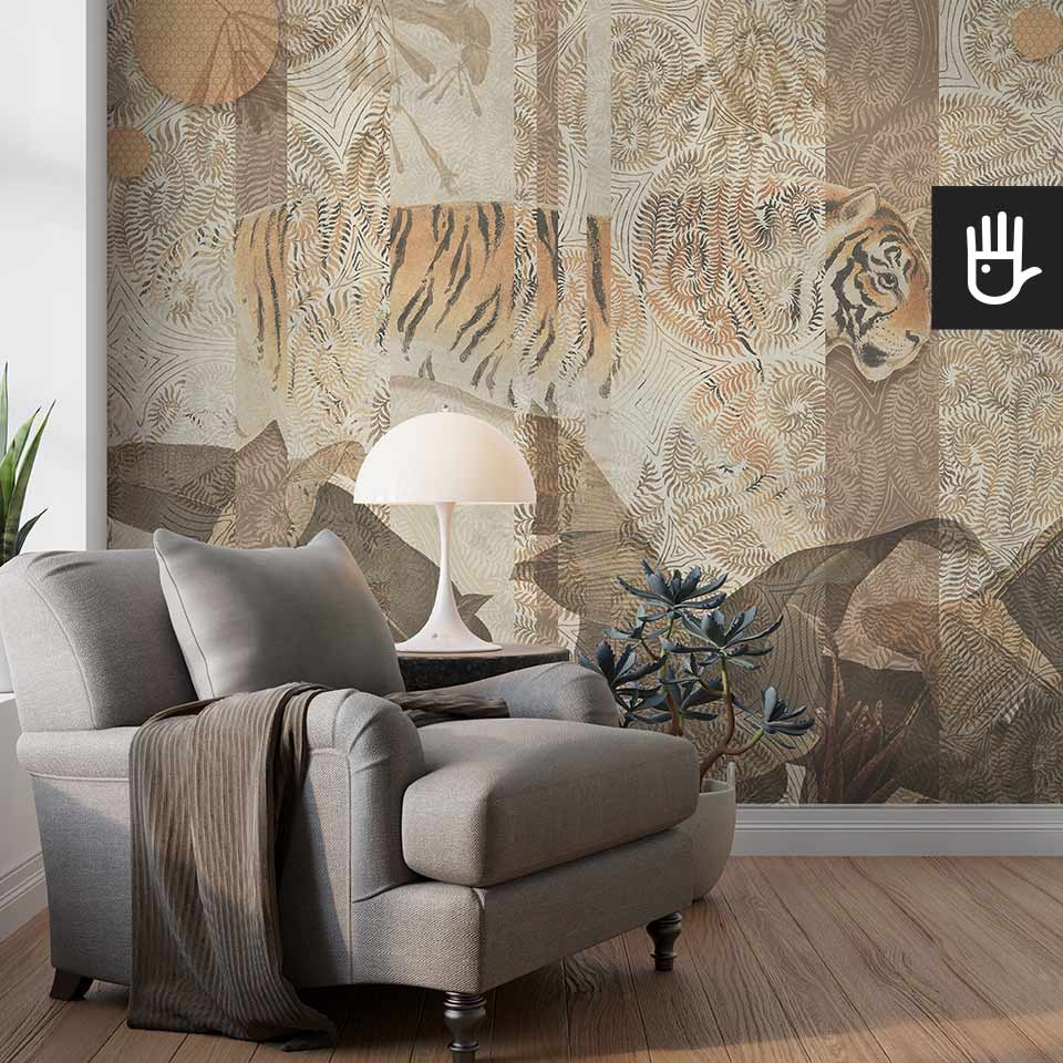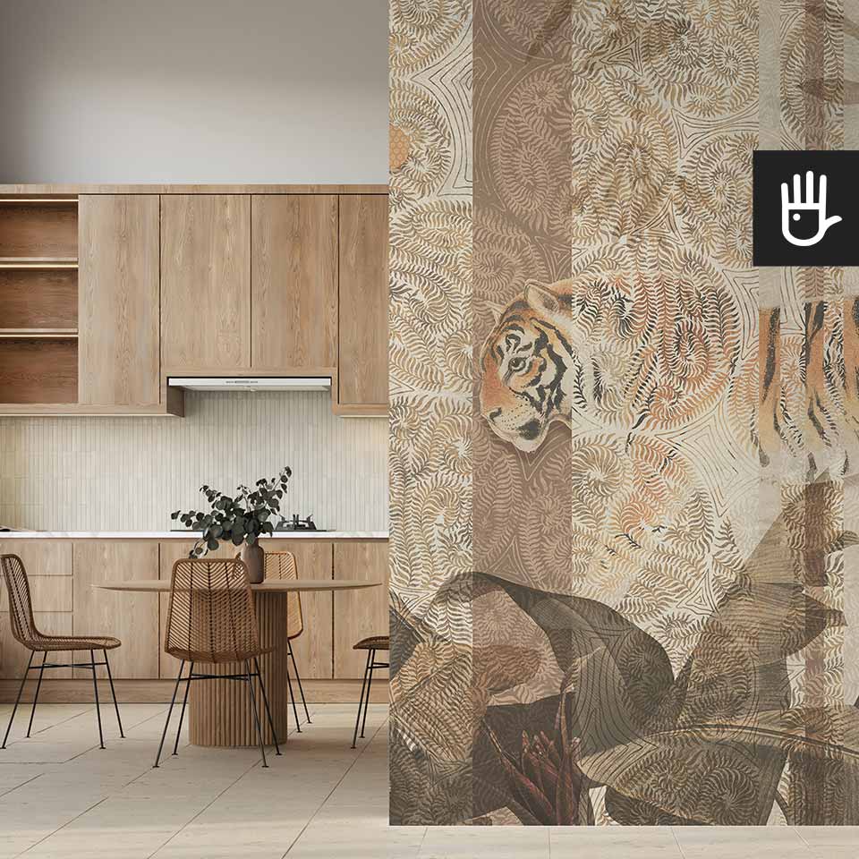 Fototapeta Beżowy Tygrys idealnie wpasuje się w ciepłe wnętrza pełne kwiatów, kolorów i drewna. Tropikalny wzór pozwoli ocieplić przestronne wnętrza, nadając im charakteru, ale sprawdzi się też w małych przytulnych aranżacjach. Botaniczne motywy w połączeniu z stonowaną paletą barw tworzą piękny obraz, który przy użyciu odrobiny wyobraźni może stać się podstawą do tworzenia ciekawych opowieści pełnych tropikalnych motywów.