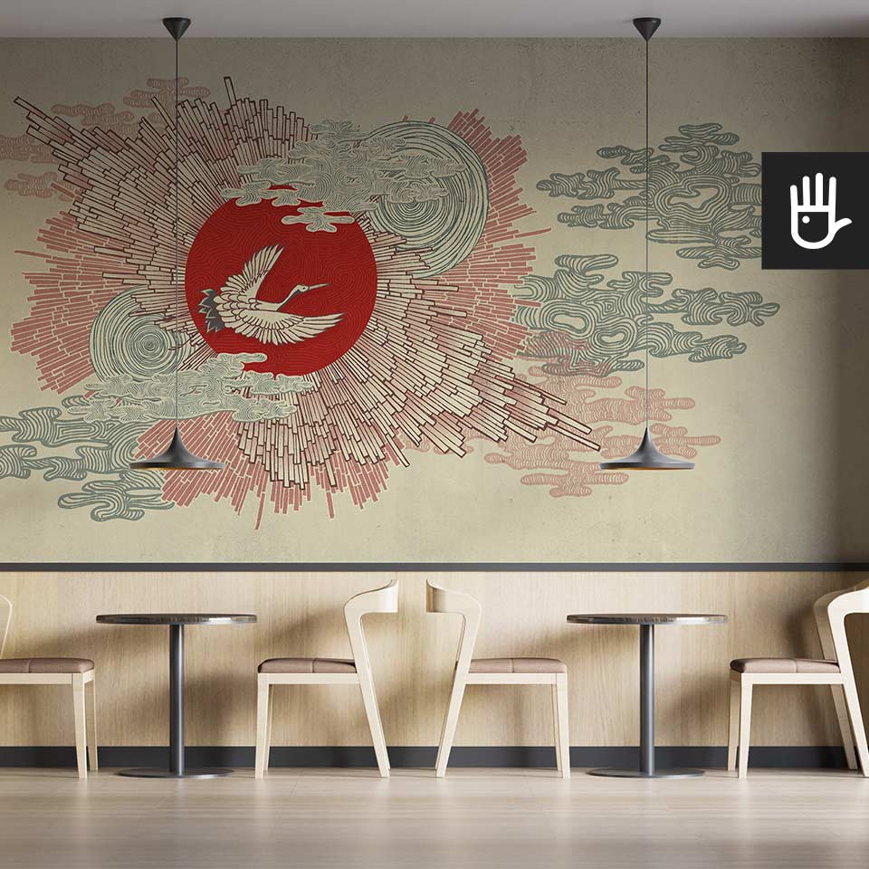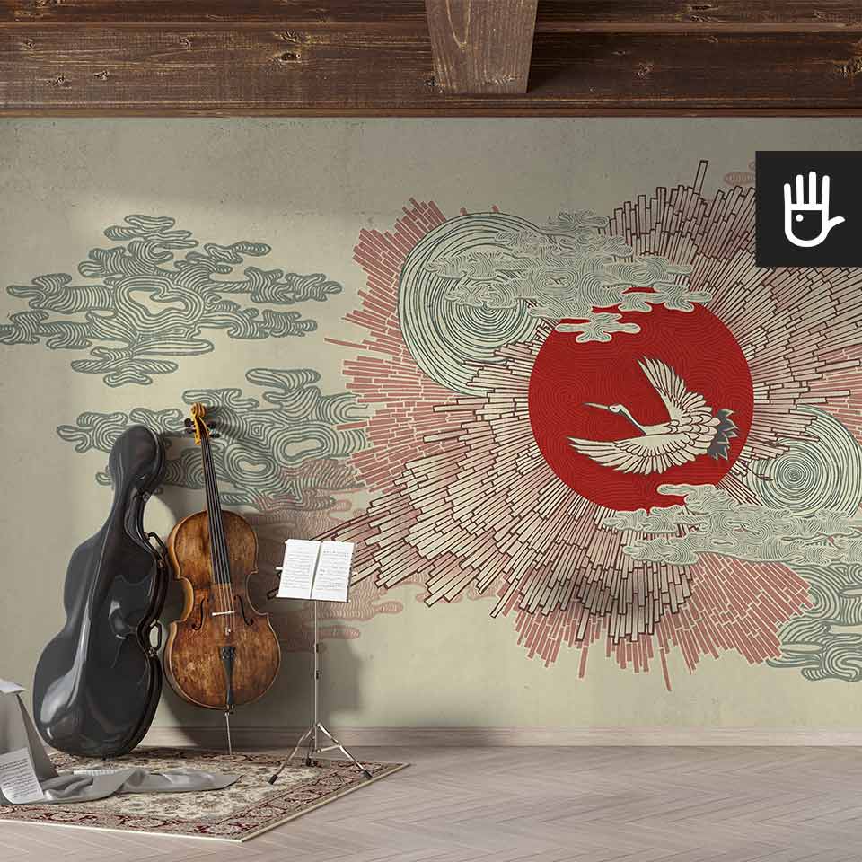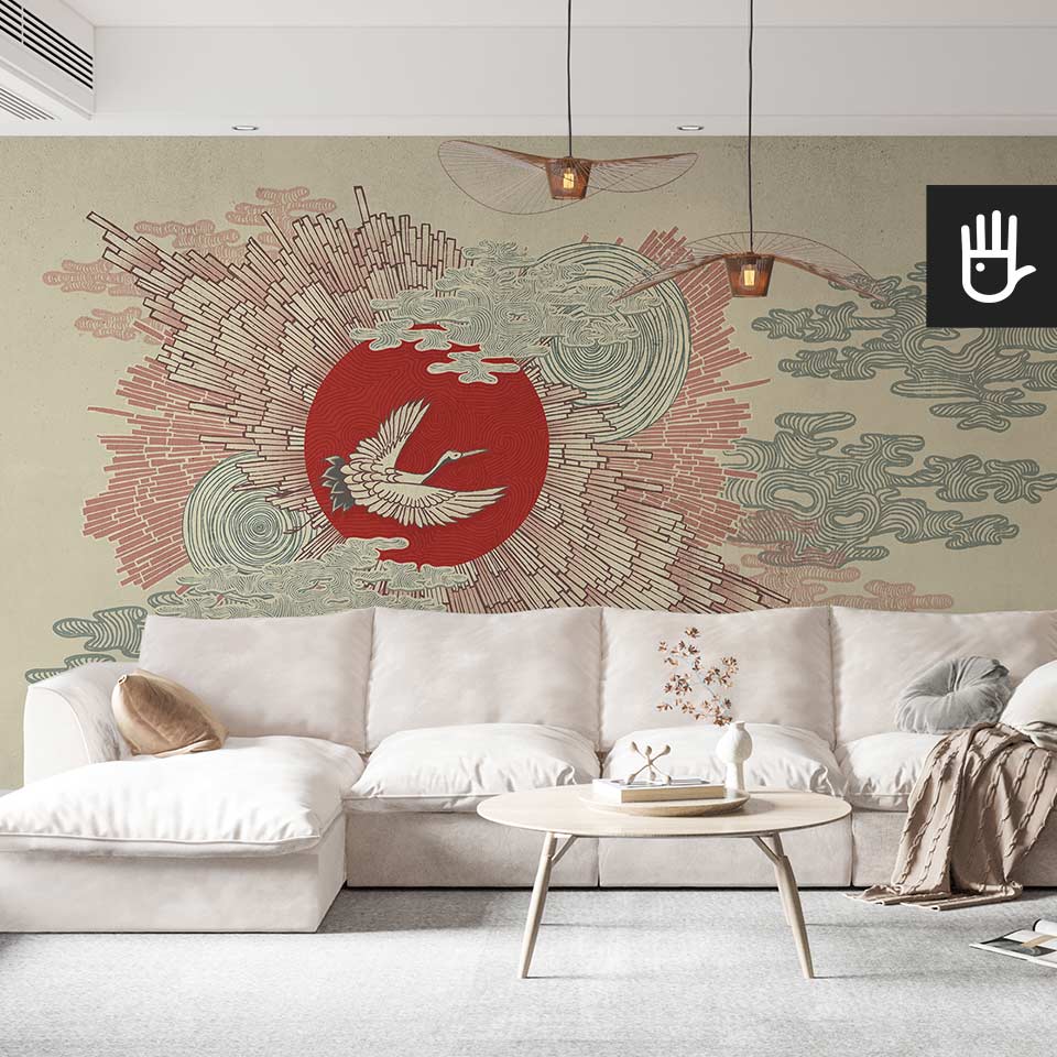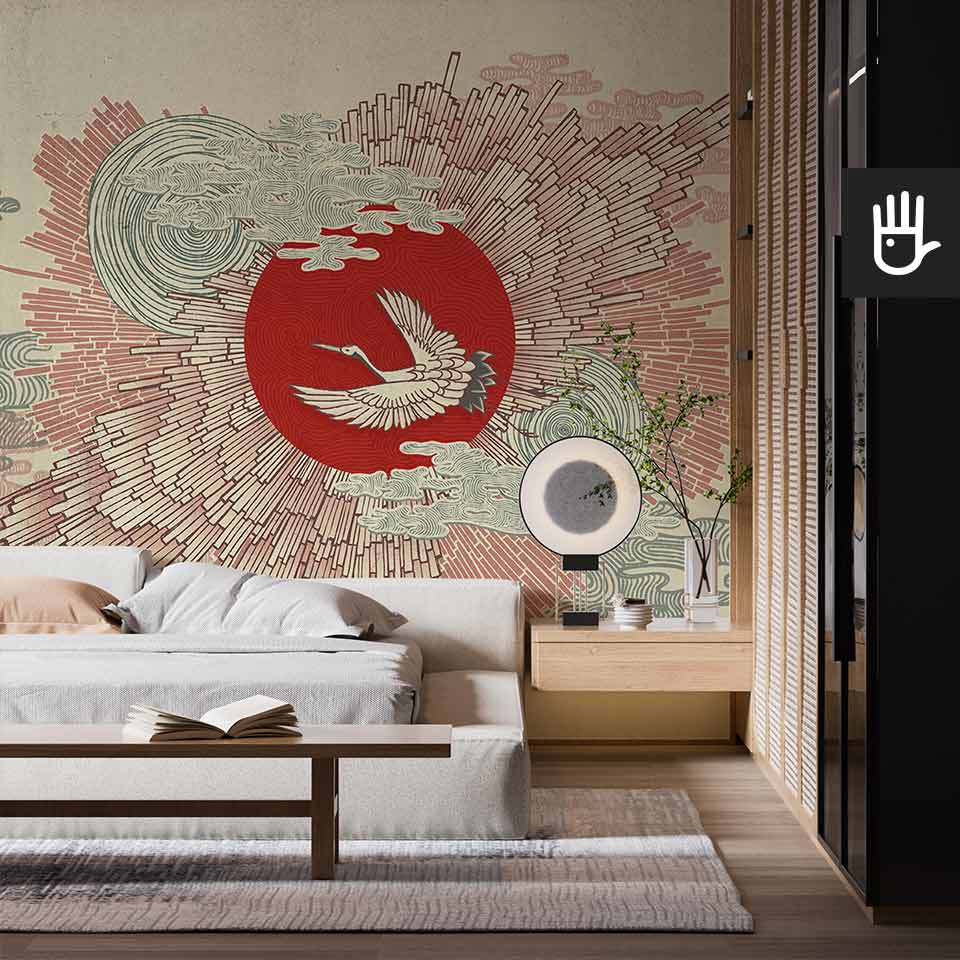 Fototapeta Japońskie Słońce z kolekcji Kamila Kowalczyka przenosi wnętrze w świat inspirowany estetyką Dalekiego Wschodu. Centralnym punktem jest symboliczne czerwone słońce, otoczone delikatnymi obłokami i geometrycznymi wzorami przypominającymi rozbłyski światła, pośród których unosi się żuraw sygnujący długowieczność i harmonię. Beżowe tło w połączeniu z betonowymi akcentami tworzy spokojny medytacyjny klimat.