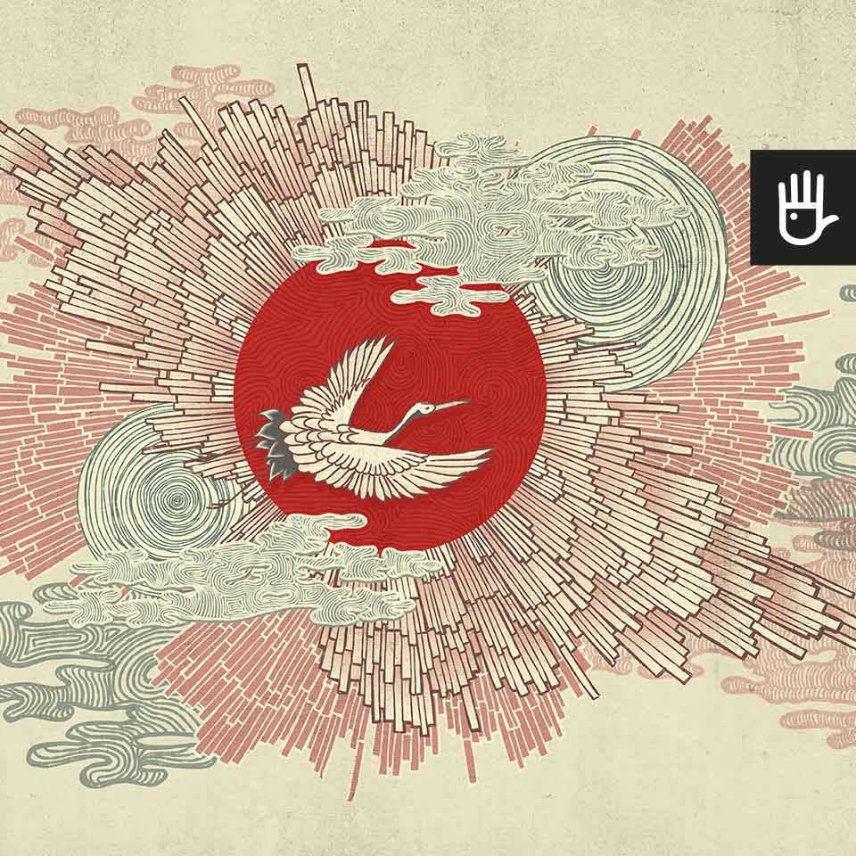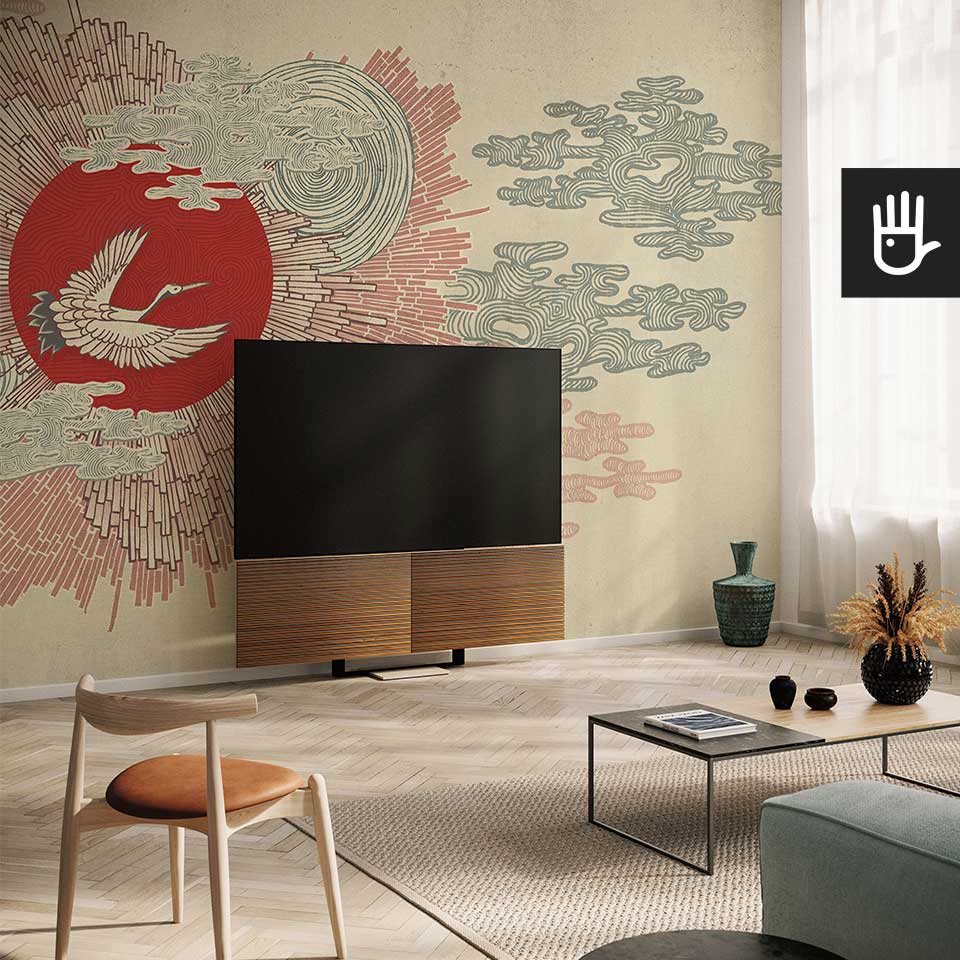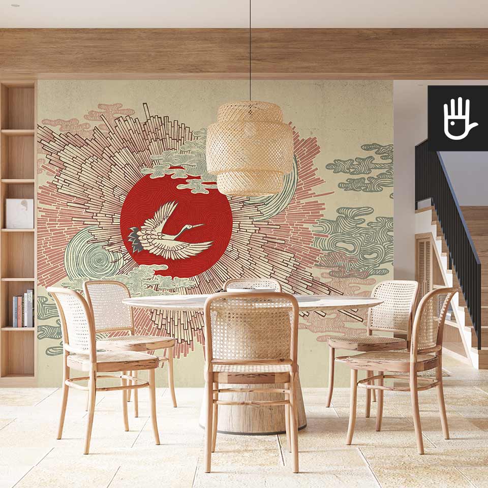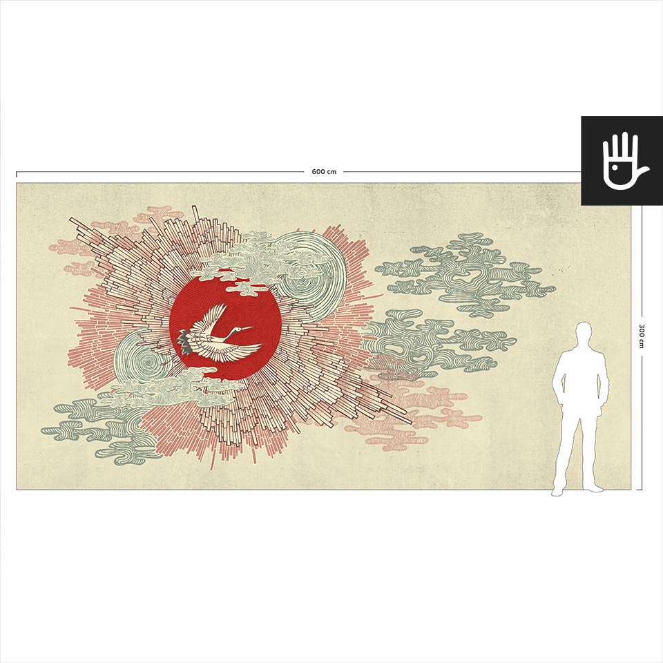 Fototapeta Japońskie Słońce z kolekcji Kamila Kowalczyka przenosi wnętrze w świat inspirowany estetyką Dalekiego Wschodu. Centralnym punktem jest symboliczne czerwone słońce, otoczone delikatnymi obłokami i geometrycznymi wzorami przypominającymi rozbłyski światła, pośród których unosi się żuraw sygnujący długowieczność i harmonię. Beżowe tło w połączeniu z betonowymi akcentami tworzy spokojny medytacyjny klimat.