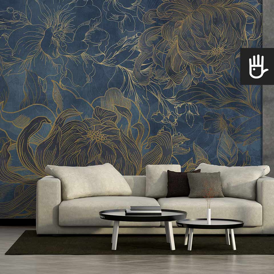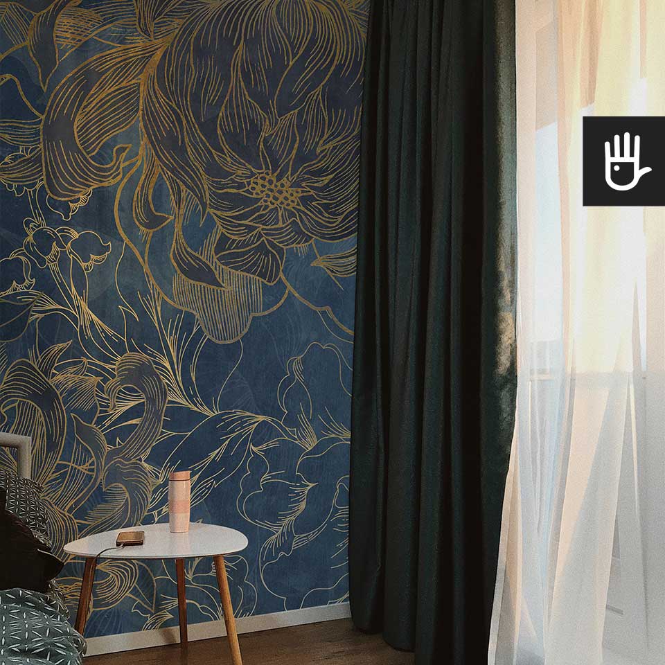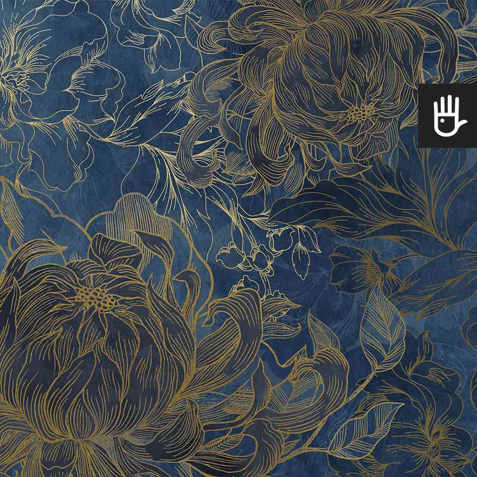Fototapeta Kwiaty Artemidy z kolekcji Dudek Manufaktura to ponadczasowa elegancka dekoracja, która zamieni zwykłe wnętrze w ogród pełen stylowych kwiatów. Wyraziste odcienie granatu i błękitu w połączeniu ze złotymi konturami tworzą idealną kompozycję, która ozdobi, ale nie obciąży dodatkowo wnętrza. Jaśniejsze kwitnące kwiaty optycznie powiększą przestrzeń, a ciemniejsze zatapiające się w tle dodadzą głębi.