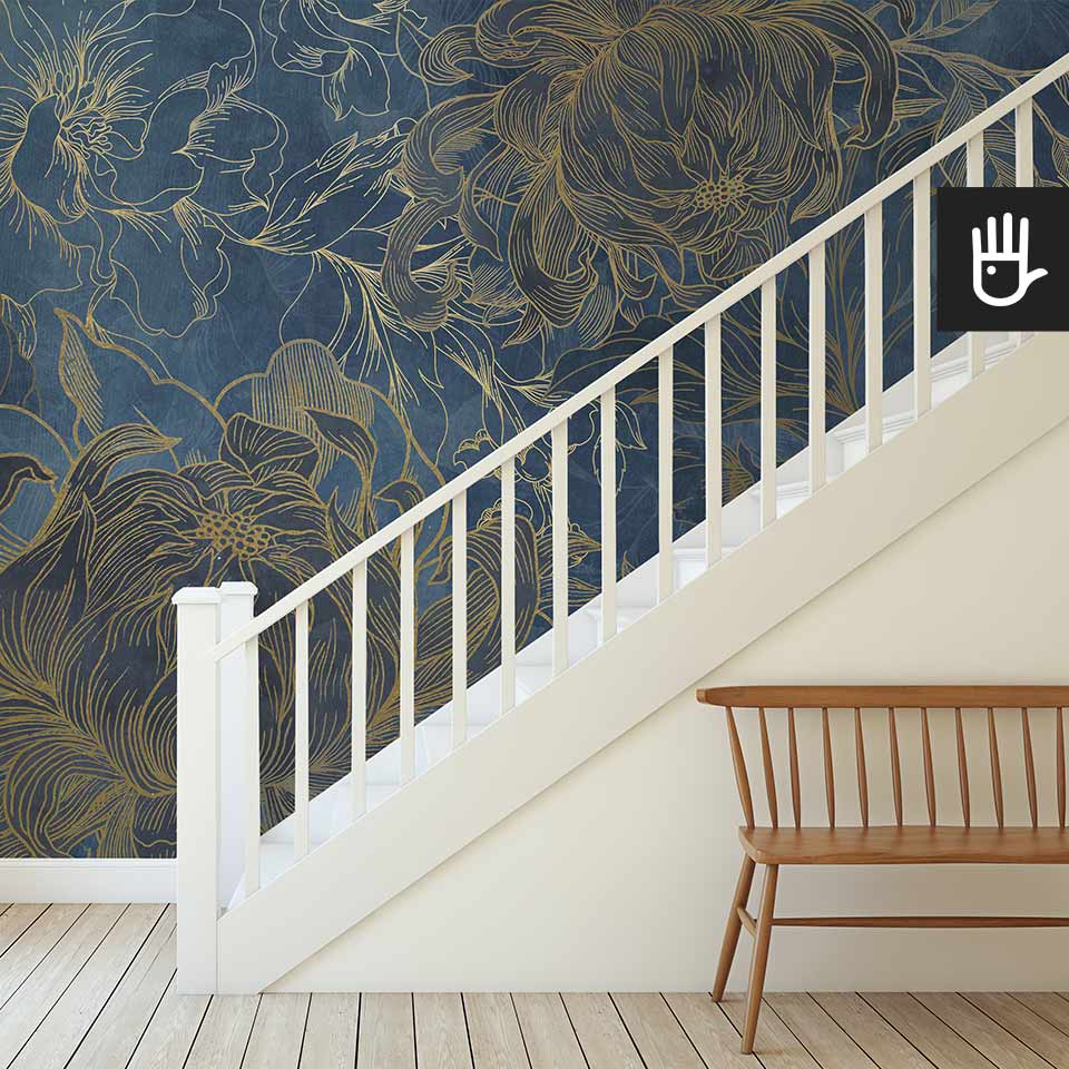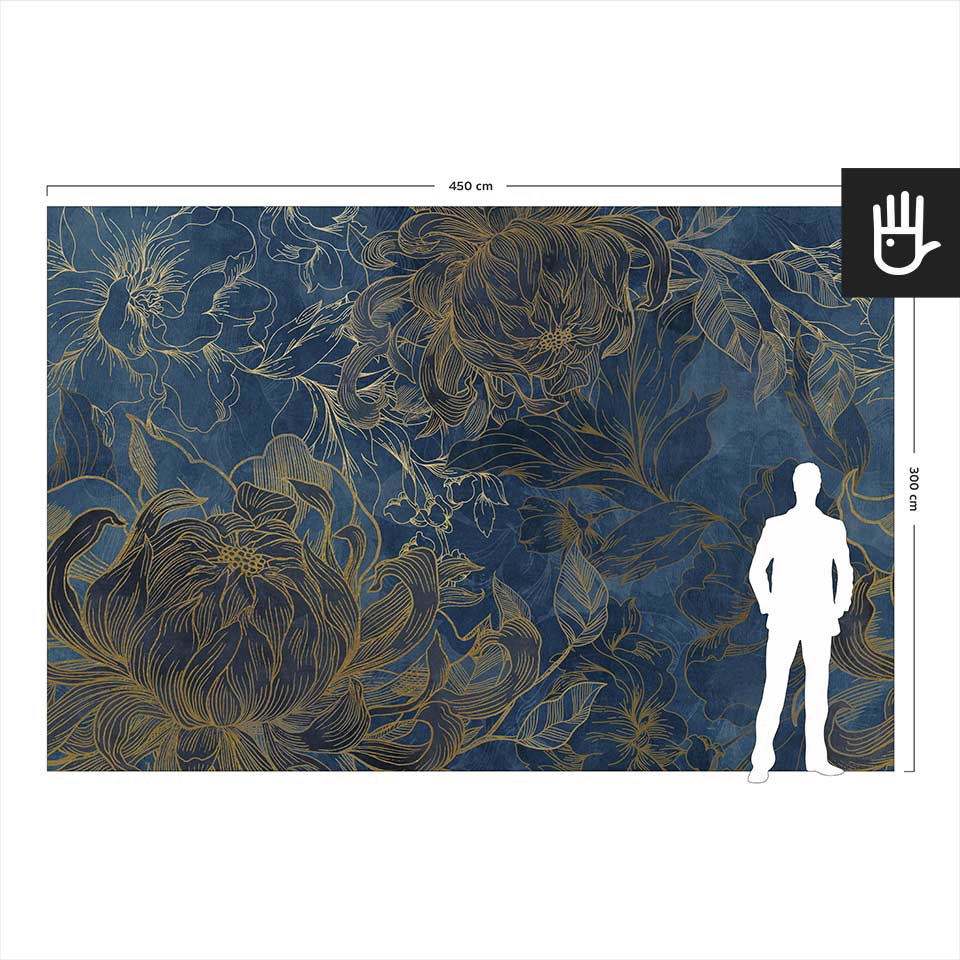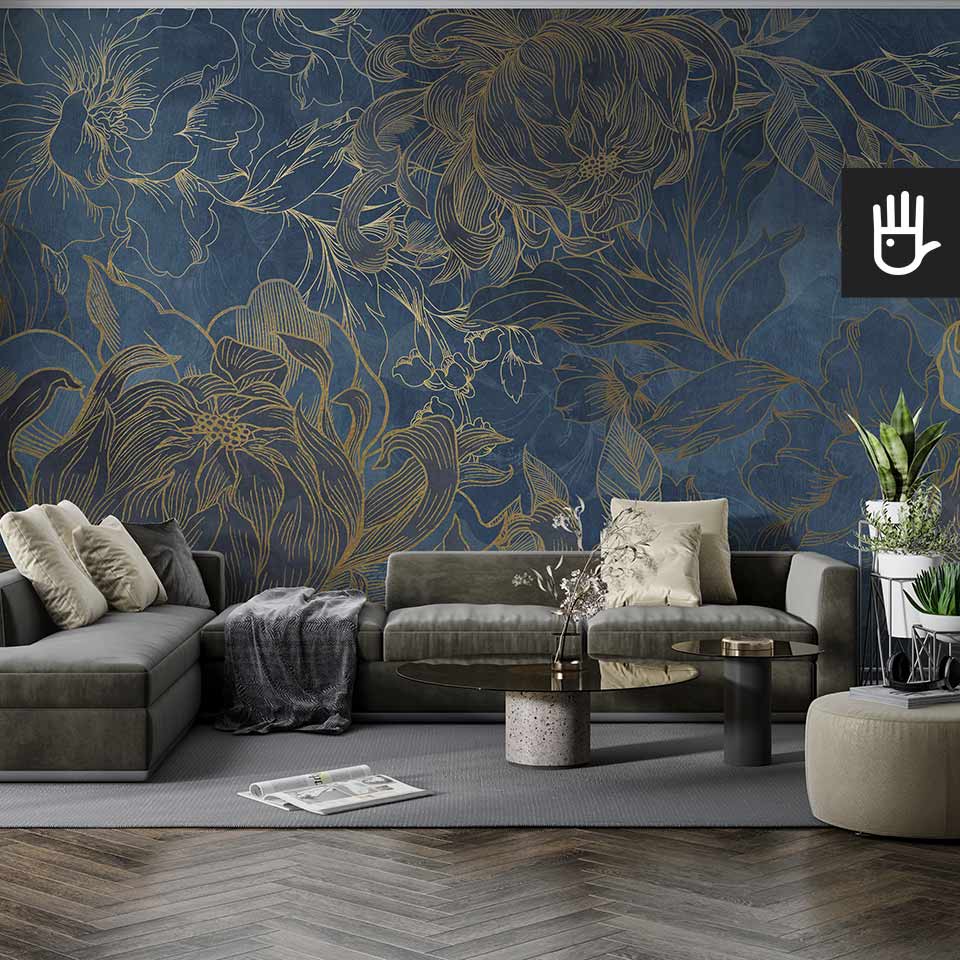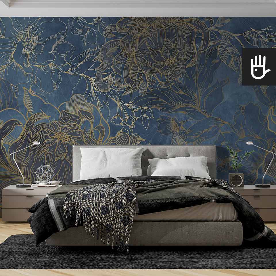 Fototapeta Kwiaty Artemidy z kolekcji Dudek Manufaktura to ponadczasowa elegancka dekoracja, która zamieni zwykłe wnętrze w ogród pełen stylowych kwiatów. Wyraziste odcienie granatu i błękitu w połączeniu ze złotymi konturami tworzą idealną kompozycję, która ozdobi, ale nie obciąży dodatkowo wnętrza. Jaśniejsze kwitnące kwiaty optycznie powiększą przestrzeń, a ciemniejsze zatapiające się w tle dodadzą głębi.