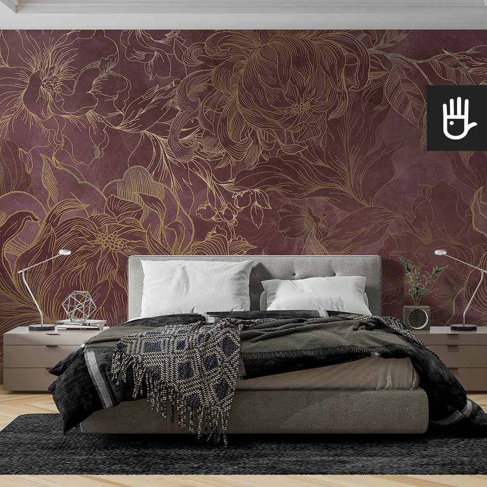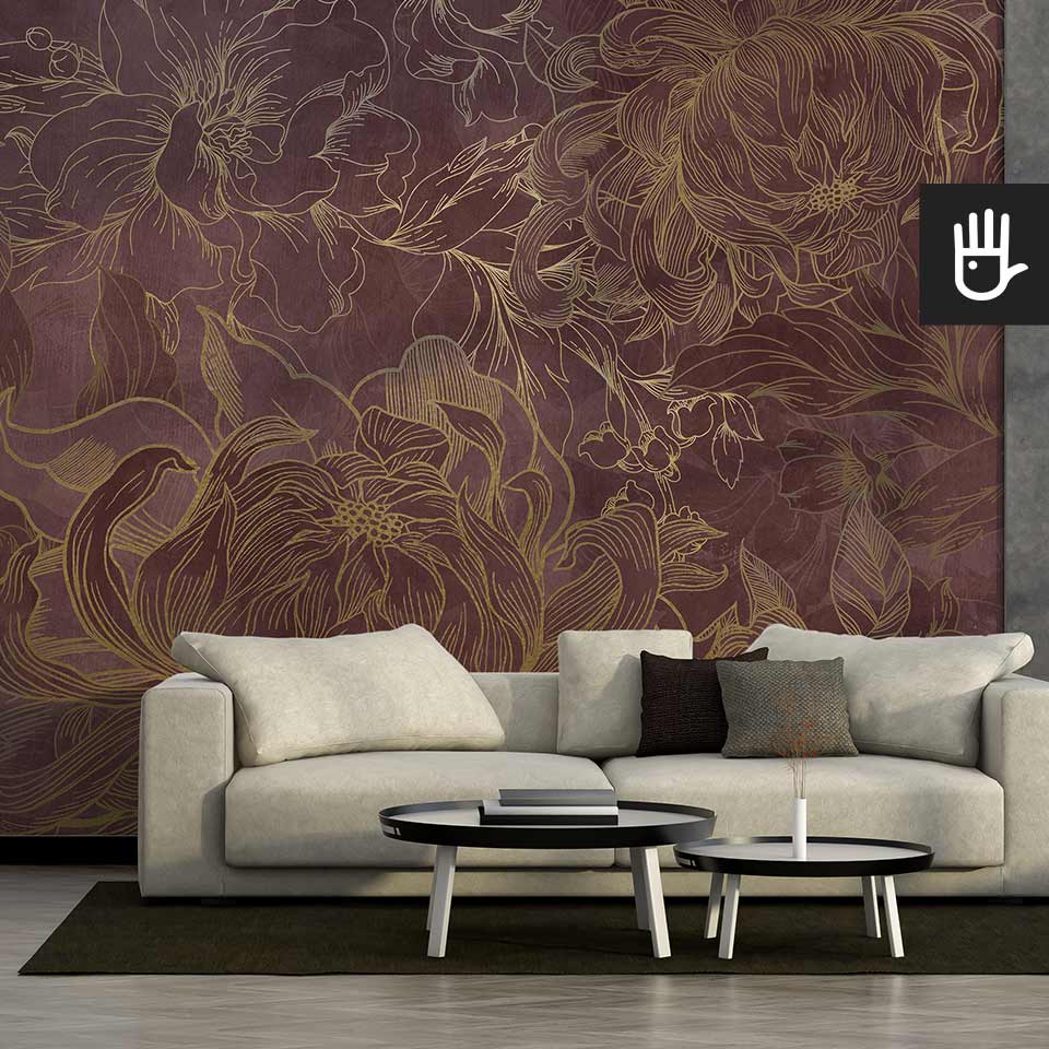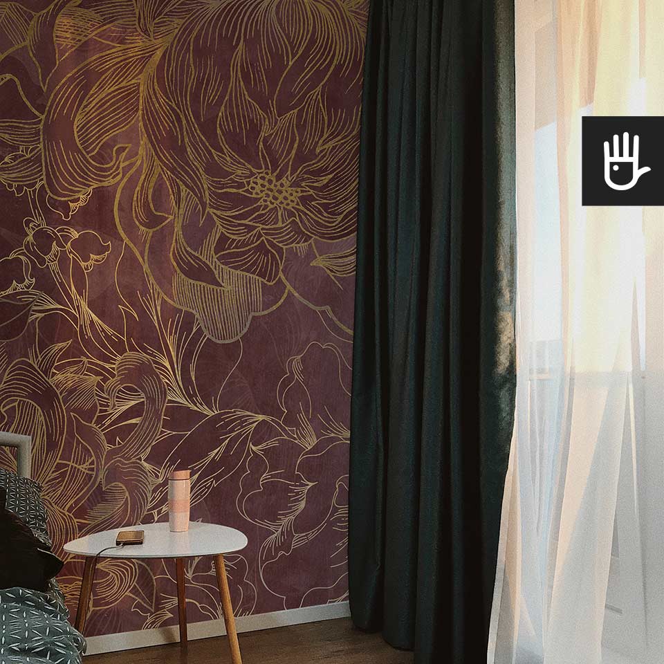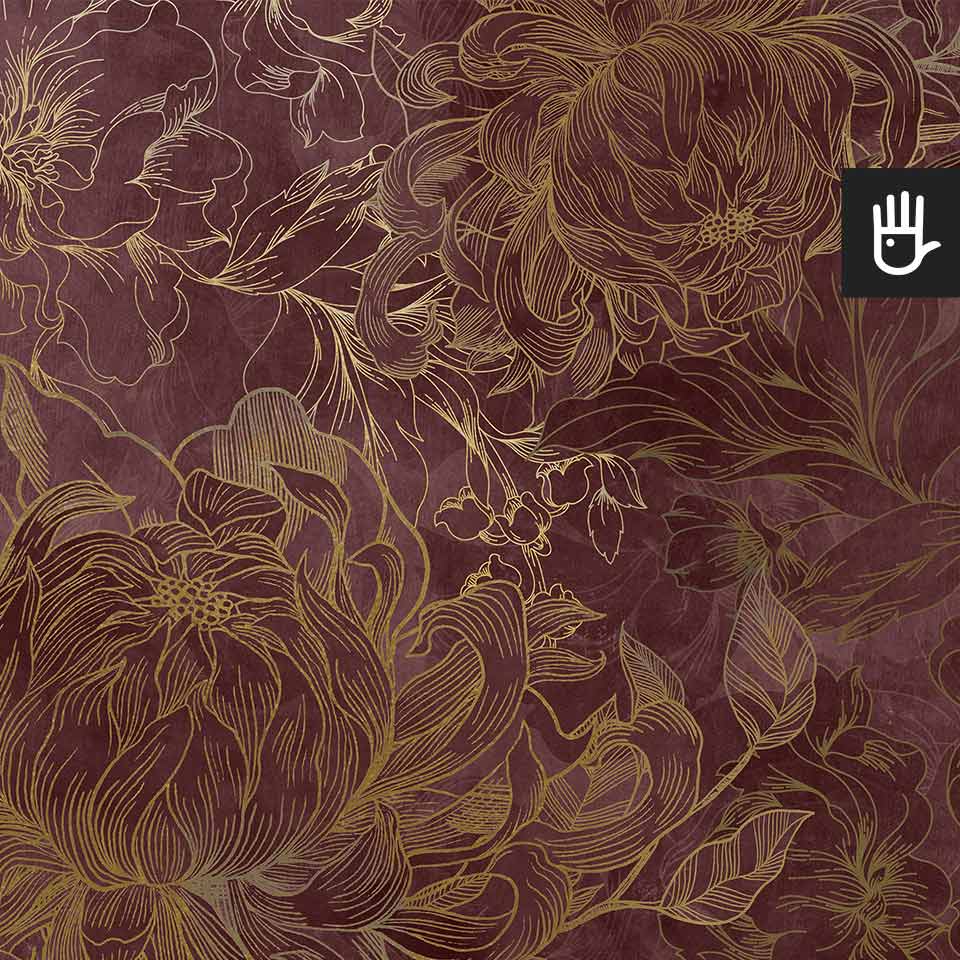 Fototapeta Kwiaty Hekate z kolekcji Dudek Manufaktura to ponadczasowa elegancka dekoracja, która zamieni zwykłe wnętrze w ogród pełen stylowych kwiatów. Wyraziste odcienie różu i bordo w połączeniu ze złotymi konturami tworzą idealną kompozycję, która ozdobi, ale nie obciąży dodatkowo wnętrza. Jaśniejsze kwitnące kwiaty optycznie powiększą przestrzeń, a ciemniejsze zatapiające się w tle dodadzą głębi.