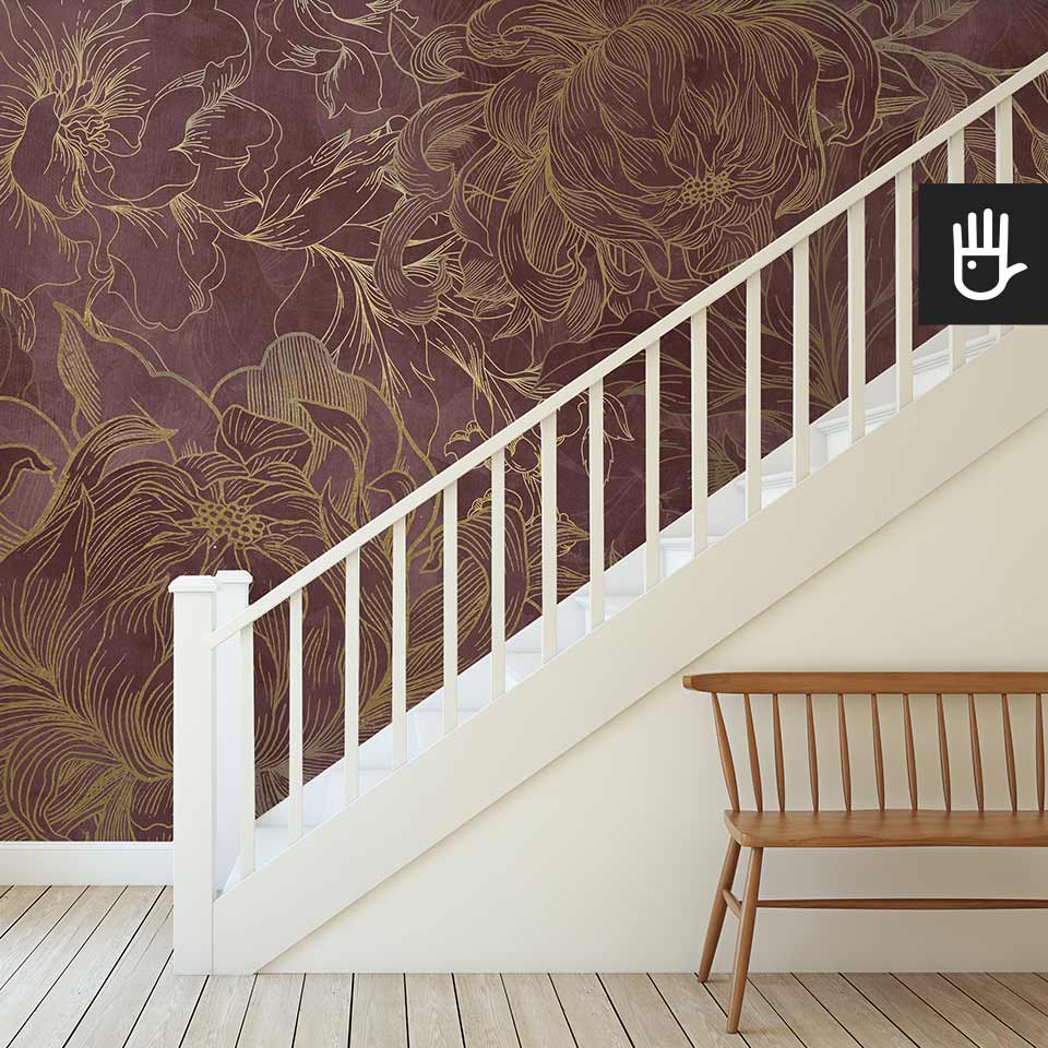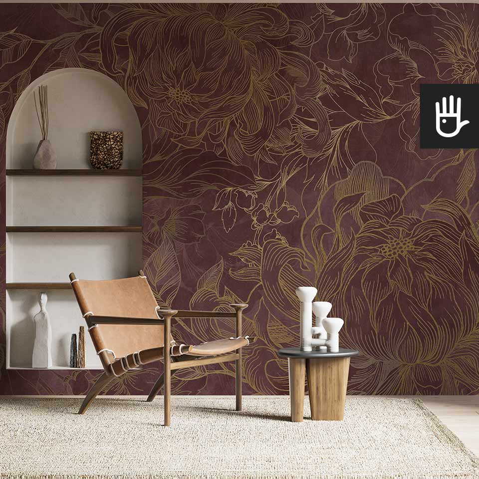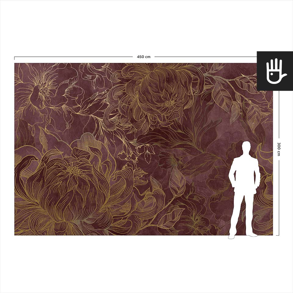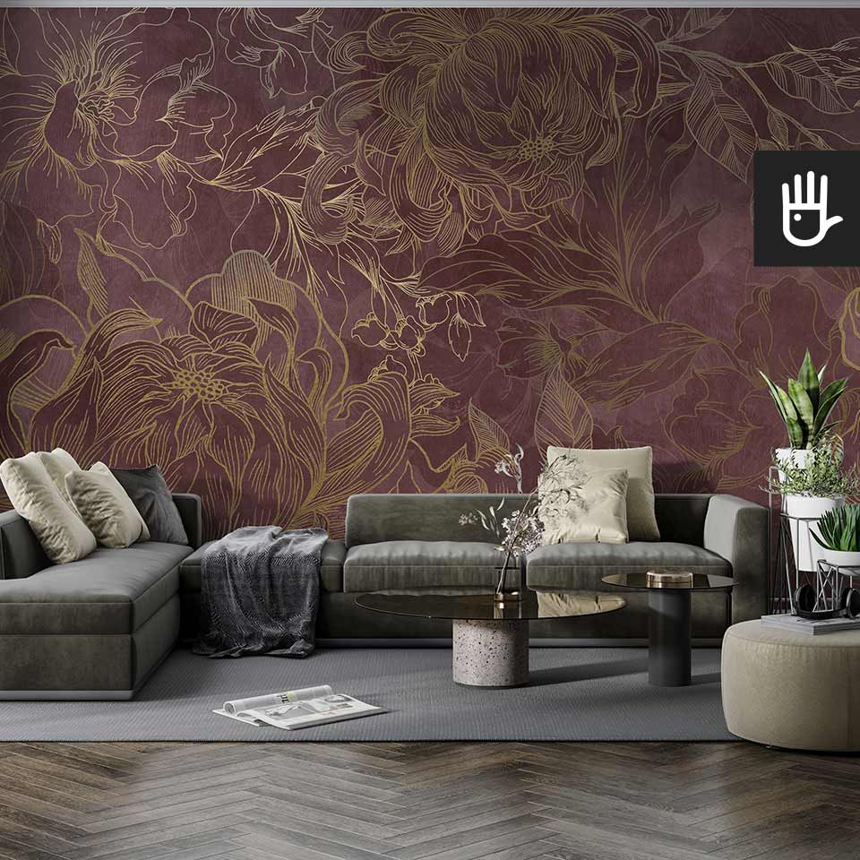 Fototapeta Kwiaty Hekate z kolekcji Dudek Manufaktura to ponadczasowa elegancka dekoracja, która zamieni zwykłe wnętrze w ogród pełen stylowych kwiatów. Wyraziste odcienie różu i bordo w połączeniu ze złotymi konturami tworzą idealną kompozycję, która ozdobi, ale nie obciąży dodatkowo wnętrza. Jaśniejsze kwitnące kwiaty optycznie powiększą przestrzeń, a ciemniejsze zatapiające się w tle dodadzą głębi.