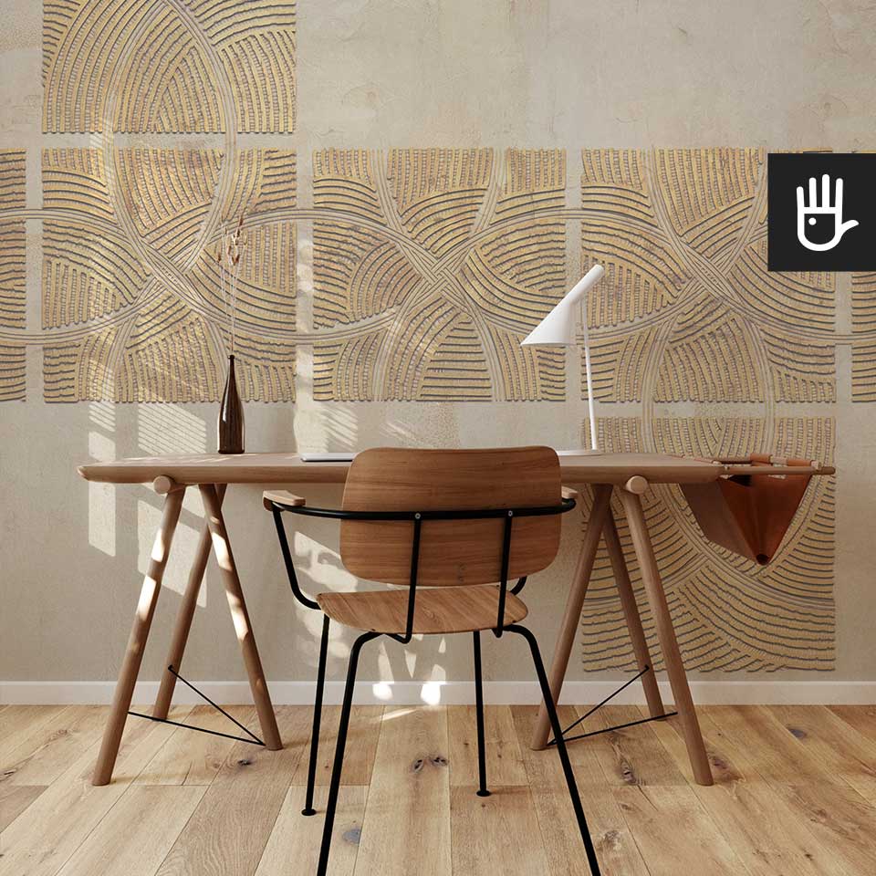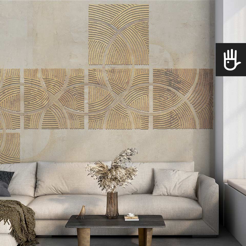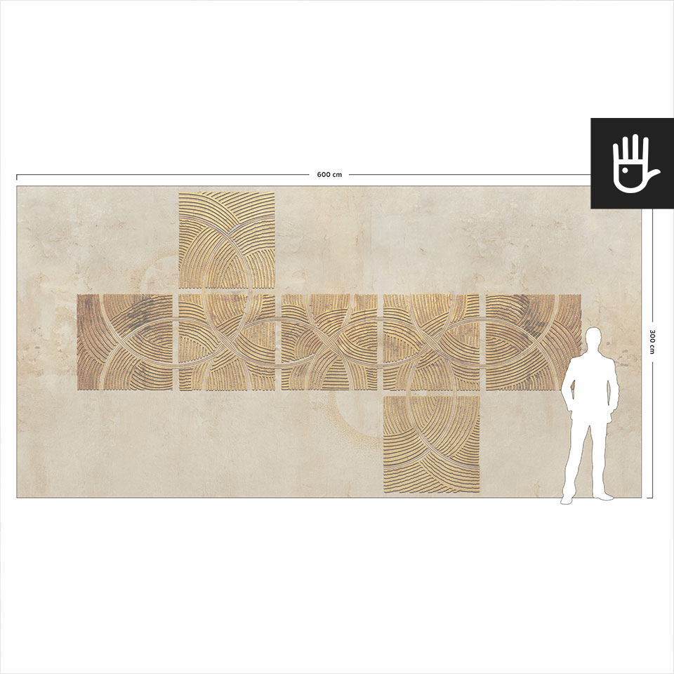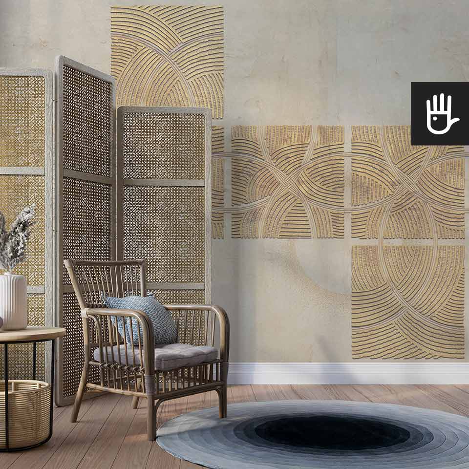 Fototapeta Złoto na betonie z kolekcji Kamila Kowalczyka wprowadzi do domu orientalny styl pełen ciepła i elegancji. Geometrycznie zdobione kafle w odcieniu starego złota idealnie komponują się z piaskowym tłem. Betonowe przetarcia i rozbłyski złotych okręgów dodają charakteru i dają wrażenie naturalnej ściany ze złotą geometryczną dekoracją.