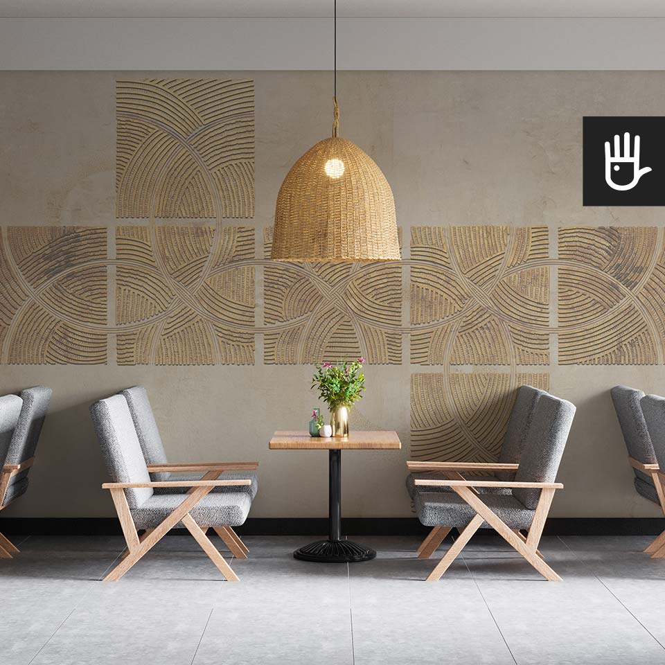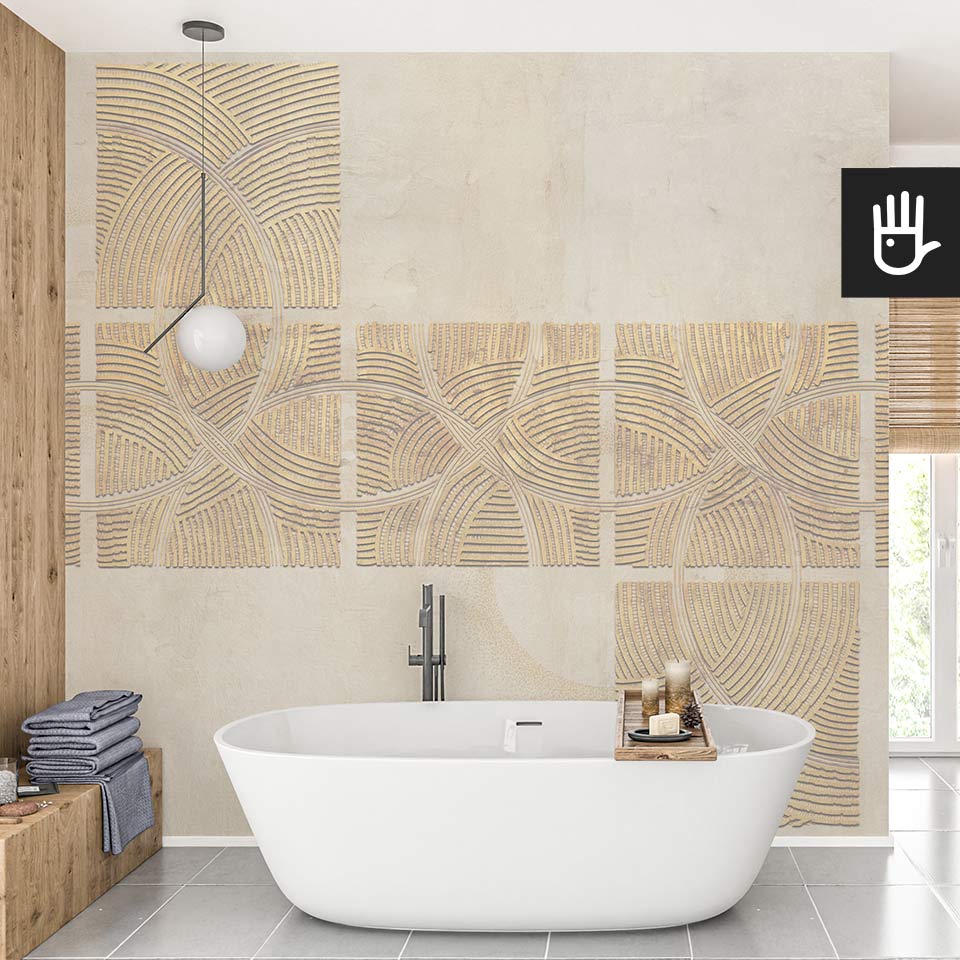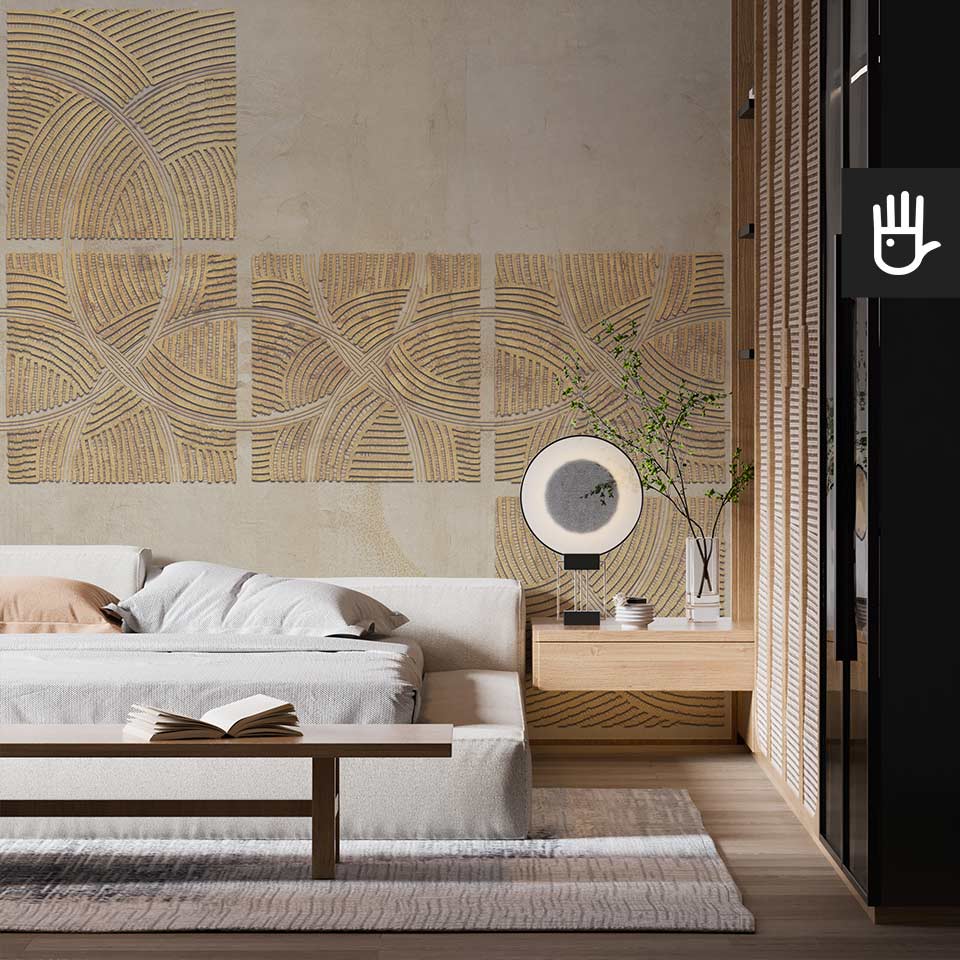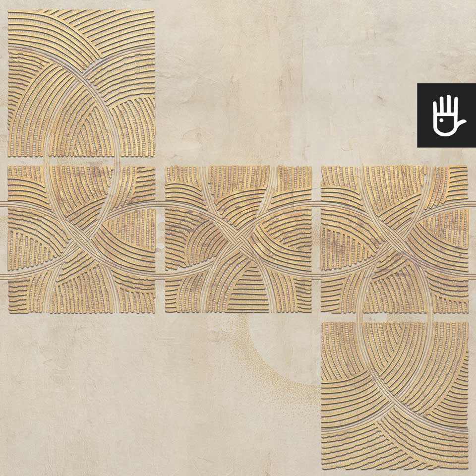 Fototapeta Złoto na betonie z kolekcji Kamila Kowalczyka wprowadzi do domu orientalny styl pełen ciepła i elegancji. Geometrycznie zdobione kafle w odcieniu starego złota idealnie komponują się z piaskowym tłem. Betonowe przetarcia i rozbłyski złotych okręgów dodają charakteru i dają wrażenie naturalnej ściany ze złotą geometryczną dekoracją.