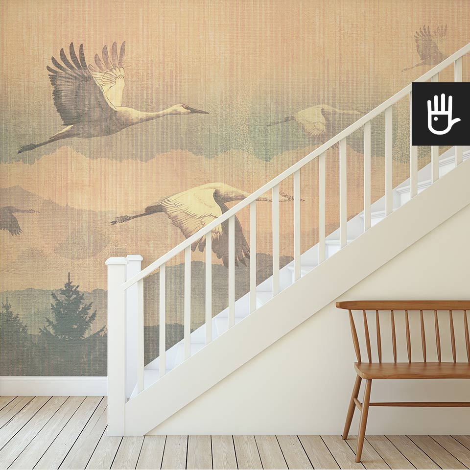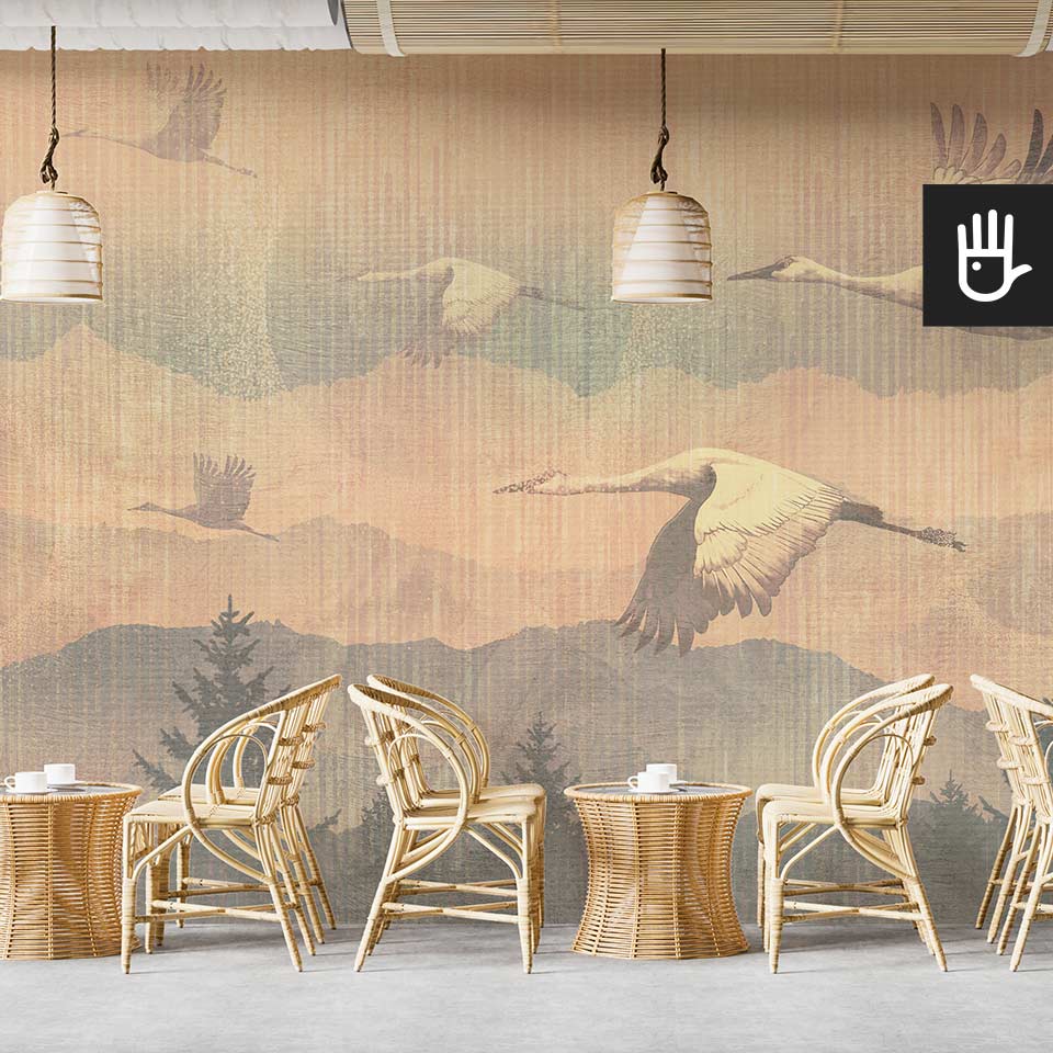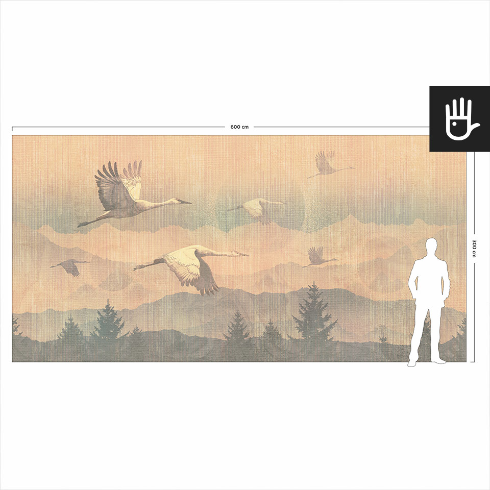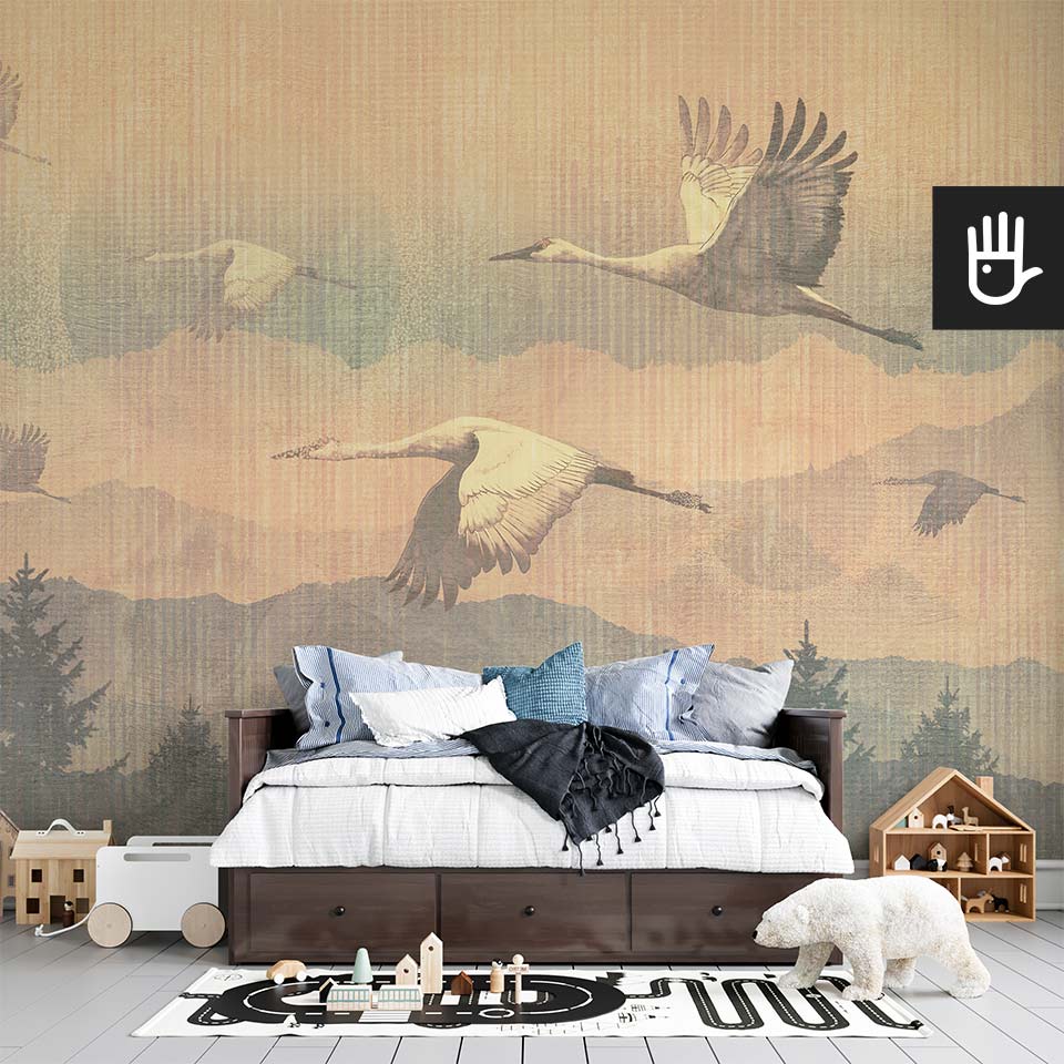 Fototapeta Żurawie nad lasem dzięki swojej stonowanej palecie barw nadają się idealnie do wnętrz w stylu boho, gdzie są dopełnieniem wystroju, ale sprawdzi się też w surowych nowoczesnych wnętrzach, dodając im delikatności i ciepła. Delikatny wzór może udekorować zarówno salon, korytarz czy nawet pokój dziecięcy, wprowadzając ciepło i piękny widok.