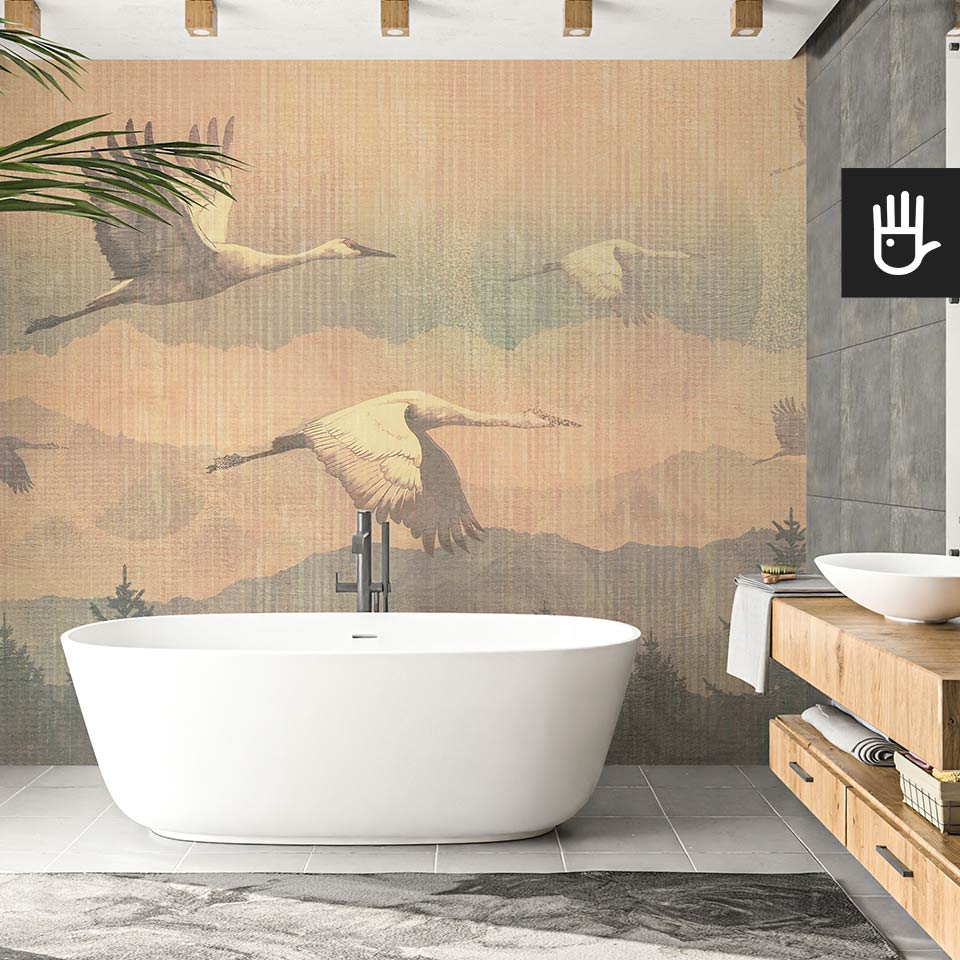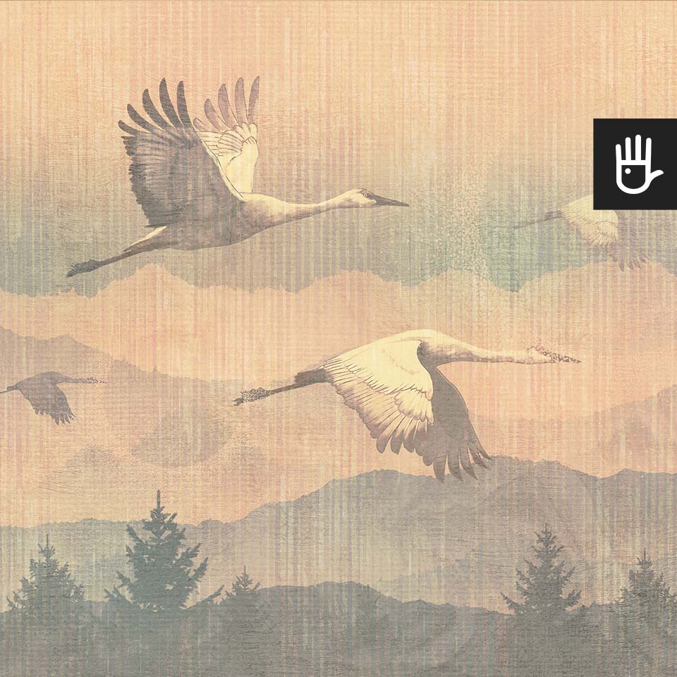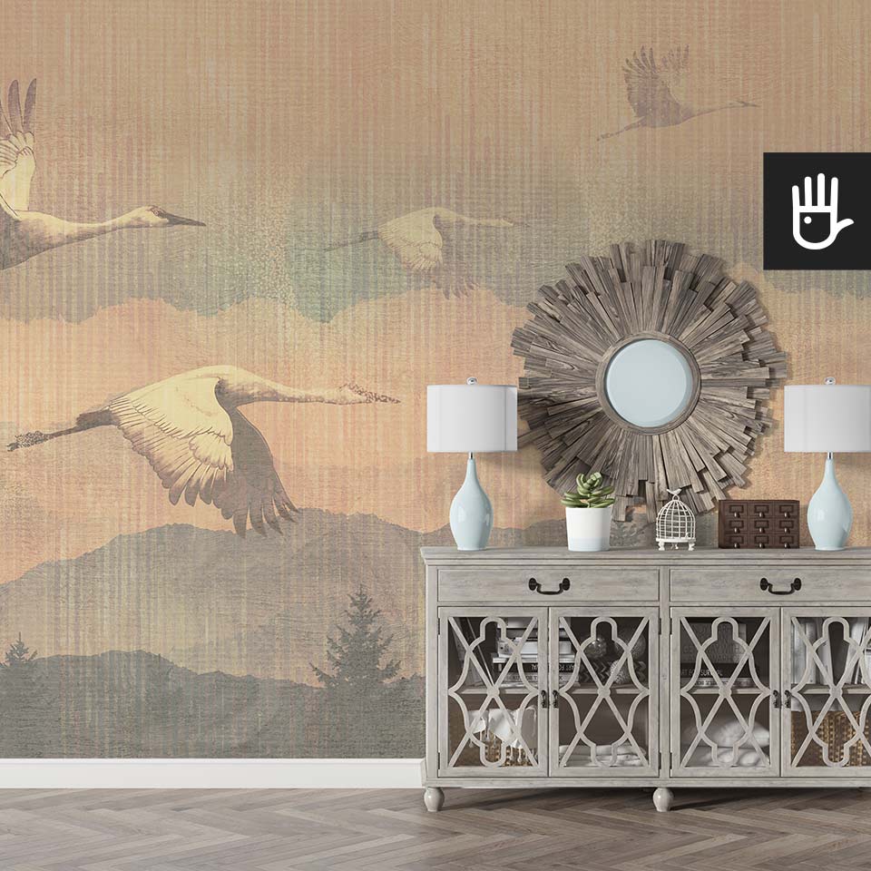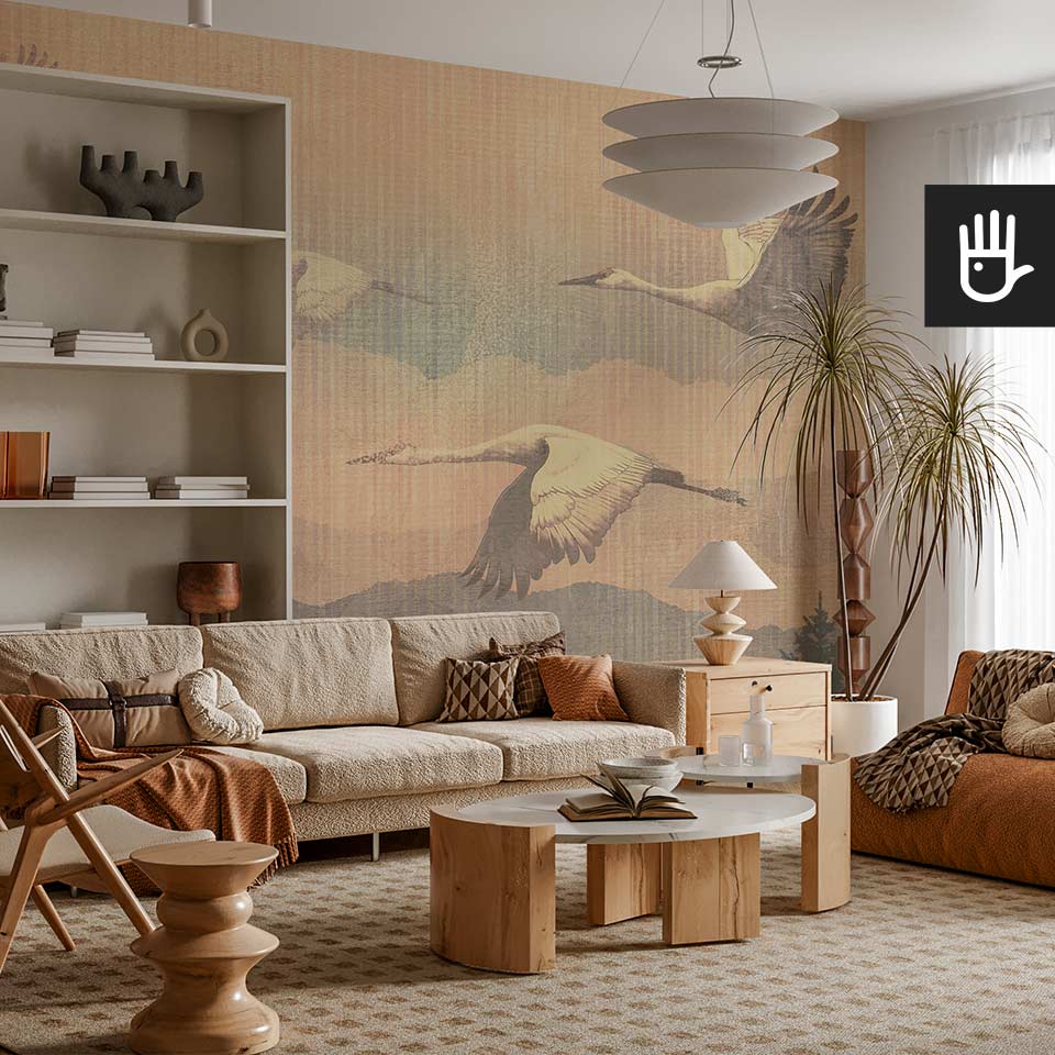 Fototapeta Żurawie nad lasem dzięki swojej stonowanej palecie barw nadają się idealnie do wnętrz w stylu boho, gdzie są dopełnieniem wystroju, ale sprawdzi się też w surowych nowoczesnych wnętrzach, dodając im delikatności i ciepła. Delikatny wzór może udekorować zarówno salon, korytarz czy nawet pokój dziecięcy, wprowadzając ciepło i piękny widok.